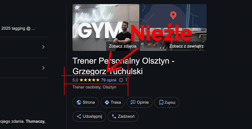 Równie imponująca jest liczba opinii na jego wizytówce Google — to ponad 70 pięciogwiazdkowych ocen od osób, które miały okazję skorzystać z usług naszego trenera. Nie mieliśmy wcześniej okazji spotkać się z tak wysoką średnią ocen!